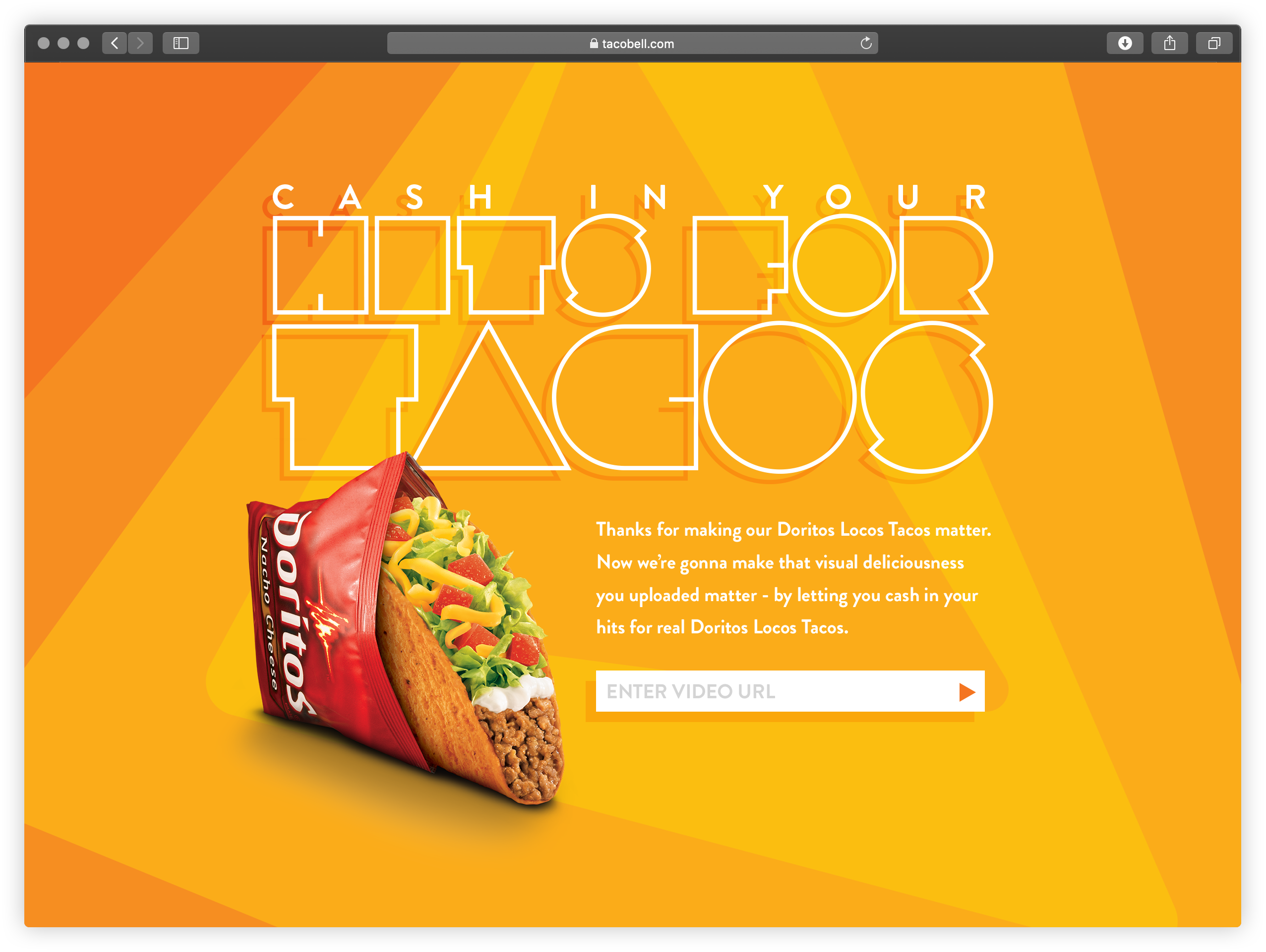As soon as it dropped in stores the response from fans online was incredible. Taco Bell wanted to find a way to reward them. So we let people to cash in their YouTube hits (on Taco Bell related videos) for actual tacos.