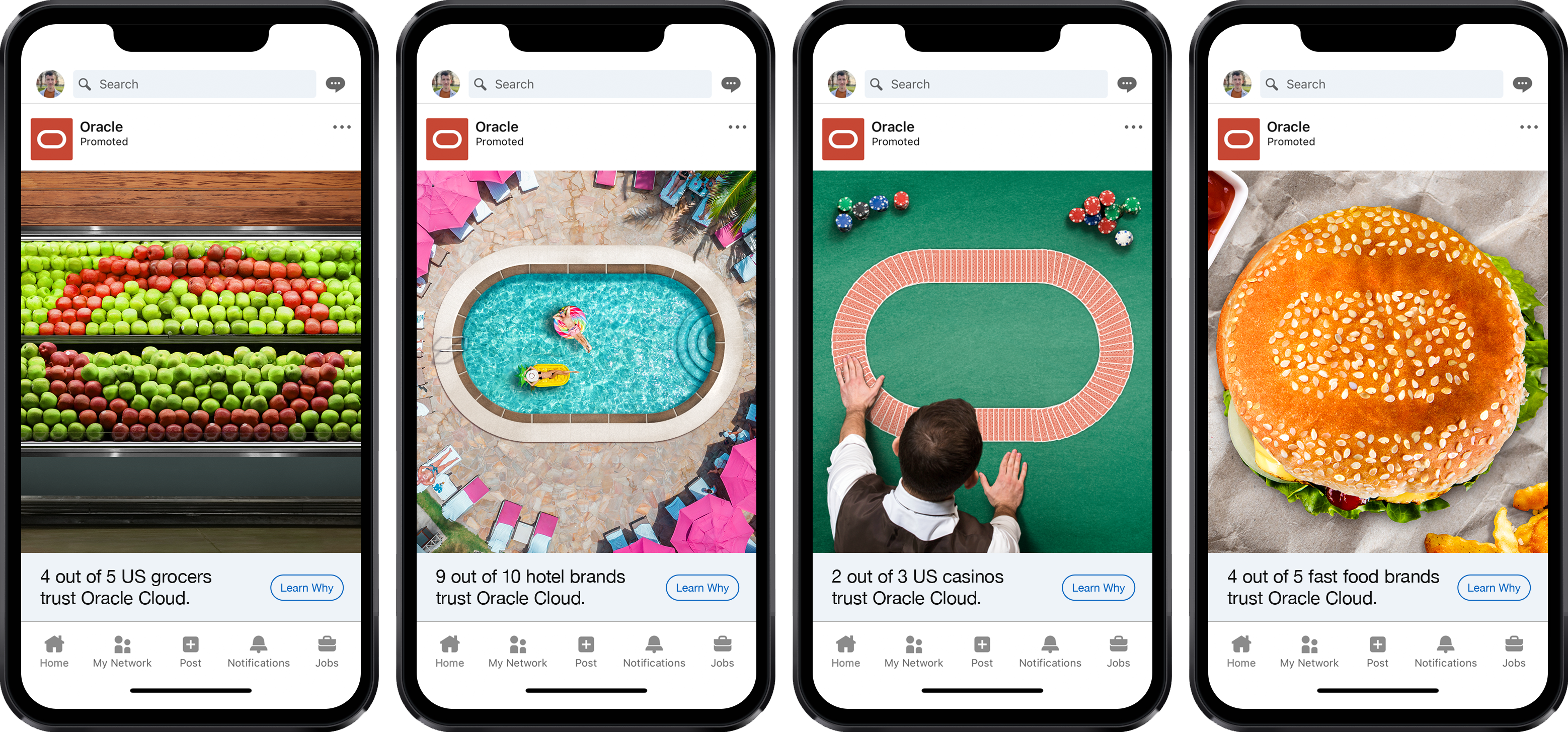 Lots of companies in lots of industries trust Oracle Cloud. We created a simple, branded visual treatment that ran as banners in the Wall Street Journal and as paid social on LinkedIn.